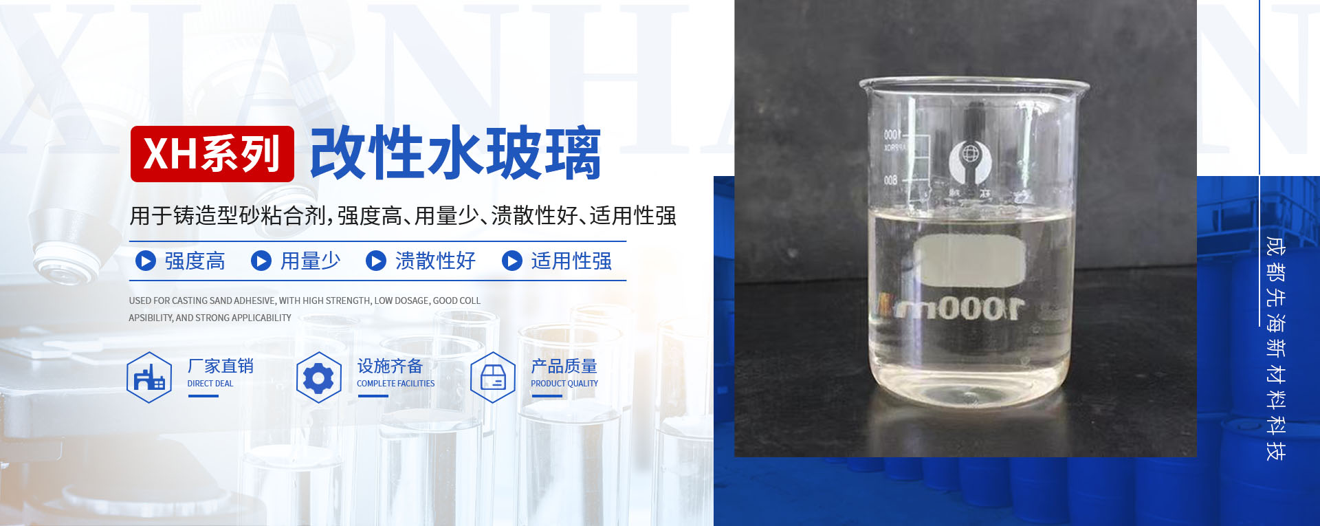成都先海新材料科技有限公司為一家以新材料技術開 發、銷售和服務為主的科技型企業,主要技術骨干為化工行 業的專家,與華東理工大學、四川大學有長期合作關 系。 公司開發成功的XH系列改性水玻璃性能好,用于鑄造 型砂粘合劑,強度高、用量少、潰散性好、適用性強,特別 是公司的一款超高潰散性改性水玻璃,其潰散性接近樹脂砂 的潰散性,解決了水玻璃砂潰散性差的一大難題。 公司的XH系列改性水玻璃生產基地坐落于德陽市旌陽 區,生產、檢測設施齊備,產品質量穩定。